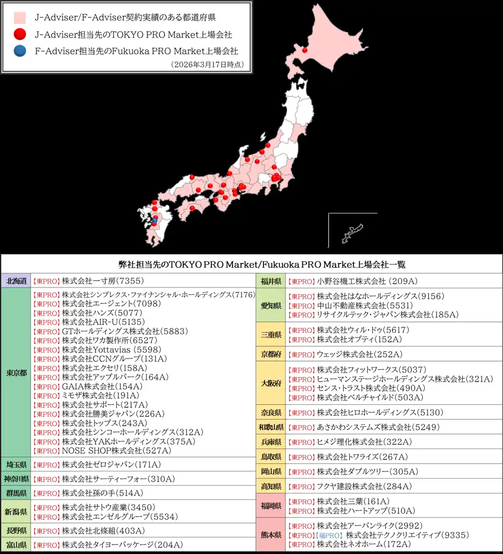 また、2024年12月には、福岡証券取引所が運営するプロ投資家向け市場、Fukuoka PRO Marketの上場指導・審査を行うF-Adviser資格も取得いたしました。 |
