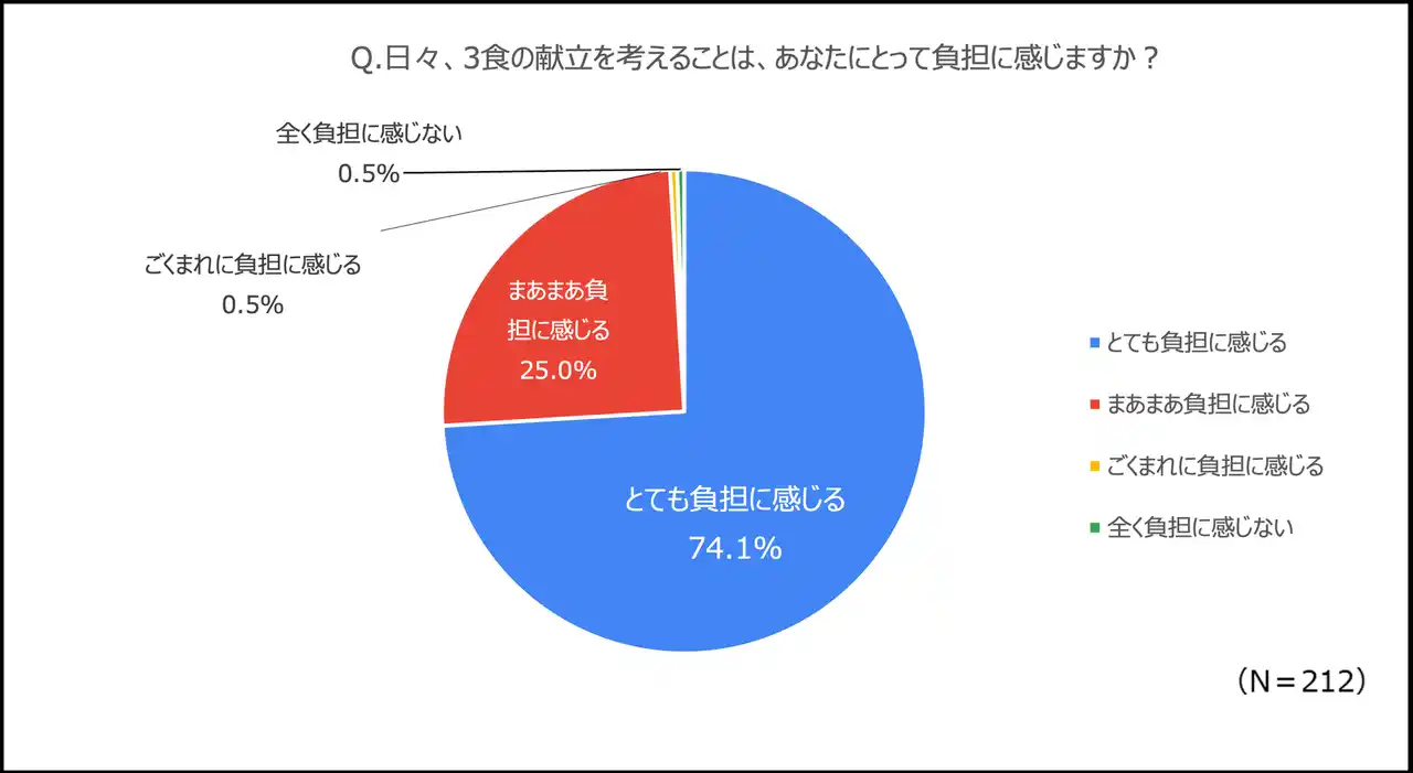 献立を考えるのは「自分(女性)」という回答が85.8%、「自分と一緒に誰か」という回答を含めると、98.6%の女性回答者が献立作りに関わっているという結果になりました。また、献立を考えることを「とても負担に感じる」という回答が74.1%、「まあまあ負担に感じる」という回答が25%ということから、多くの女性が家事の一つである献立づくりを負担に感じていると考えられます。 |