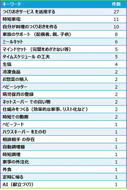 不安の解消には、「つくりおきサービスを利用する」「時短家電」といった家事負担を解消するサービスや製品の回答が多く、ほか、「自分が料理のつくりおきを作る」「家族のサポート」といった家族内での助け合いや、自分が家事を行うという回答もありました。 |