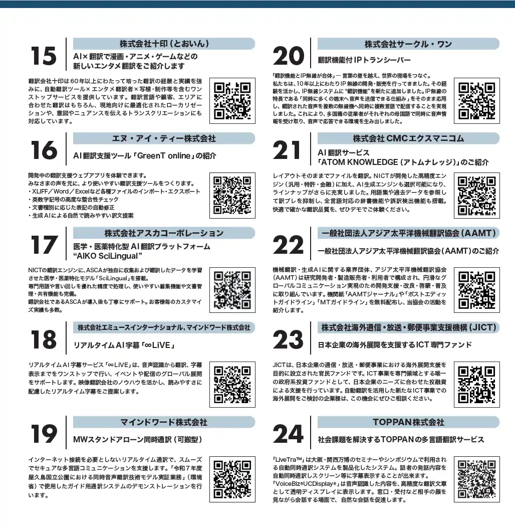 当日は同会場にて、翻訳事業に携わる国内企業・団体(24者)によって、最先端の同時通訳技術の研究開発や最新の製品・サービス等が紹介されました。 |