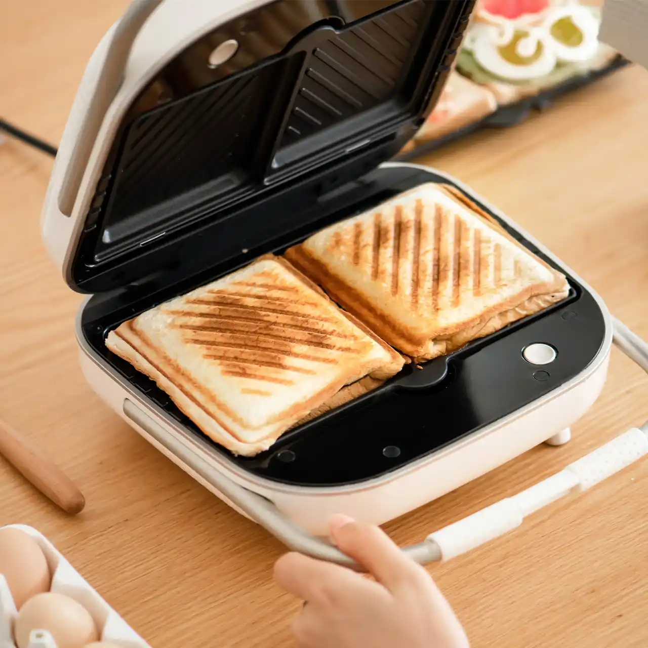 食材の厚みに合わせてハンドルロックを2段階で調整でき、最大5cmまで対応。耳までカリッとした厚焼きサンドを簡単に作れます。 |