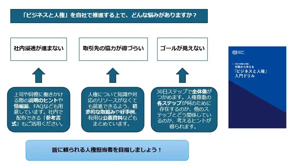 今回のネットワーク会議では、国内外の労働問題の最前線を知る国際労働機関(ILO)の田中氏を講師にお迎えします。 先日ILOが出版した『30日で理解と実践 労働から考える「ビジネスと人権」入門ドリル』をベースに、日本社会が直面している課題と、企業には国際基準の「ビジネスと人権」への対応が強く求められていることから、企業が今すぐ取り組むべき実践策を分かりやすく解説いただきます。 |