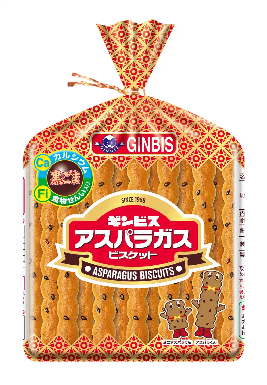「アスパラガスビスケット」は1968年に発売のビスケット。当時のビスケットといえば、丸形や楕円形、四角の形状が主流だった中、経営方針である『3つのI』のひとつ「Independent(独創性)」の考えのもと革新的なスティック型で発売。発売当初から現在まで巾着のパッケージはデザインがほとんど変わっていません。 素朴な甘じょっぱさが魅力で、からだに優しい食物繊維とカルシウムを配合。8つの節があることが特長で、”外はカリッと、中はサクッと”した食感が楽しめます。 |