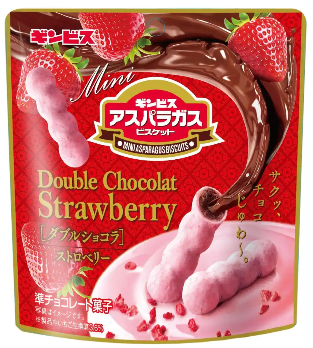 「ミニアスパラガス ダブルショコラストロベリー」は、しみチョコミニアスパラガスにフリーズドライのいちごパウダーが入ったいちごチョコをコーティングした、これまでにない贅沢な味わいが楽しめる商品です。まろやかなチョコのくちどけとさっくりとしたビスケットの食感が絶妙なハーモニーを生みだし、いちごのやさしい甘さとほのかな酸味が口いっぱいに広がり、春の訪れを感じさせてくれます。 いちごのやさしい香りが広がる、この時期にしか食べられない季節限定の「ミニアスパラガス ダブルショコラストロベリー」を是非、ご賞味ください。 |