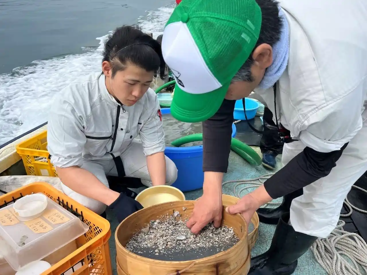 漁業者が取り組む底生生物調査の様子 |