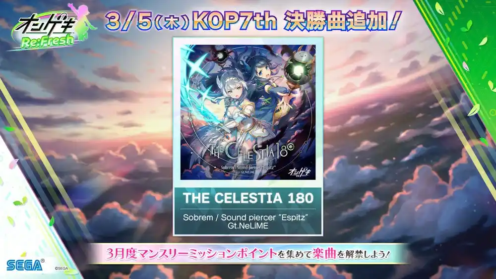 3月5日(木)より、「KING of Performai The 7th」決勝楽曲として登場した「THE CELESTIA 180」が追加!3月マンスリーミッションを進めると楽曲が解禁され、先行してプレイできるようになります。 |