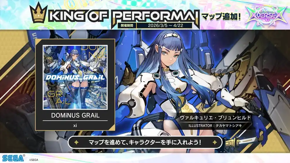 2026年3月5日(木)より、「KING of Performai The 7th」マップが登場!全国決勝大会で登場した新曲「Verse X」「DOMiNUS_GRAiL」も追加されます!さらに、こちらのマップを進めることで、新たなキャラクター「チュウニペンギン/Re:Generation」「ヴァルキュリエ・ブリュンヒルド」がゲットできます。 |