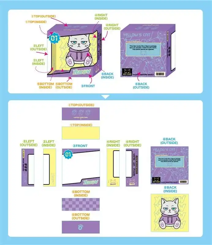 前・後ろ・左右・上・下の6面すべてにデザインを配置できるため、 キャラクターやロゴ、イラストを閉じ込めたような表現など、 遊び心のあるデザイン展開が可能です。 |