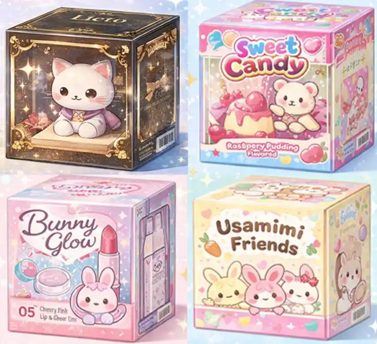 ・キャラクターが閉じ込められているデザイン ・お菓子の箱のようなデザイン ・コスメパッケージ風デザイン ・キャラクターグッズ風ボックス ・ブランドロゴ入りミニパッケージ |
