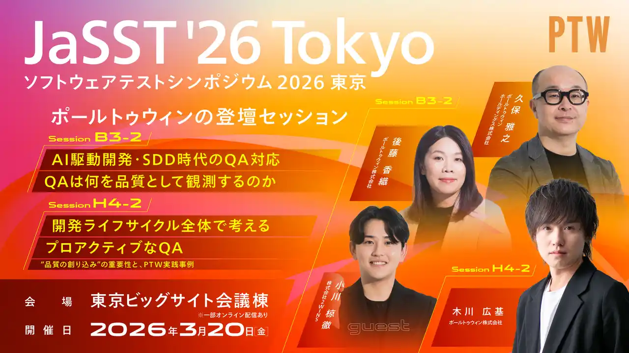東京大学発のAIスタートアップ企業である株式会社2WINS(本社:東京都文京区、代表取締役CEO:小川椋徹、以下「2WINS」)の代表取締役CEO 小川椋徹は、2026年3月20日(金)に東京ビッグサイトで開催されるソフトウェアテスト分野の国内最大級の技術カンファレンス「ソフトウェアテストシンポジウム2026東京(JaSST'26 Tokyo)」において、サービス・ライフサイクルの課題解決を支援するポールトゥウィン株式会社(本社:愛知県名古屋市、代表取締役CEO:志村 和昭、以下「ポールトゥウィン」)のテクノロジーセッションにゲスト登壇することをお知らせします。 |