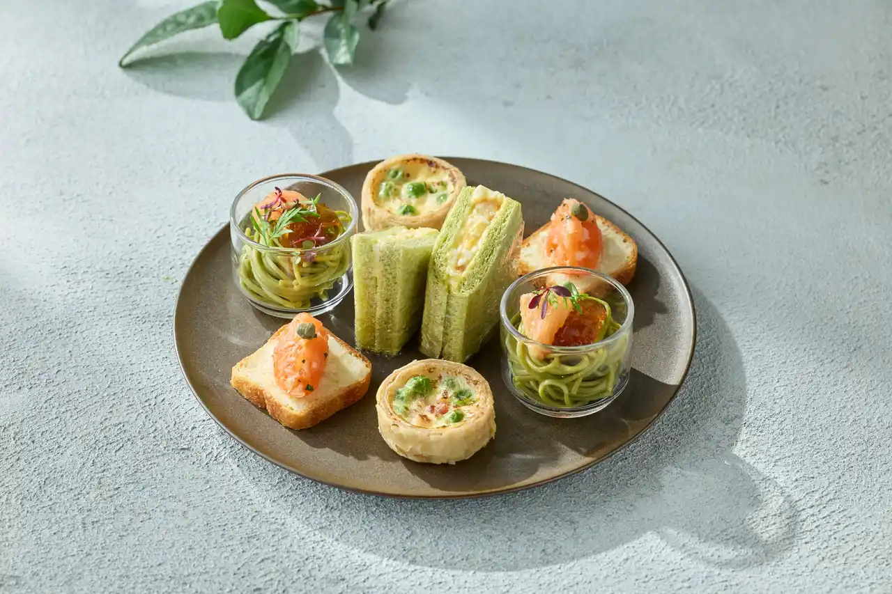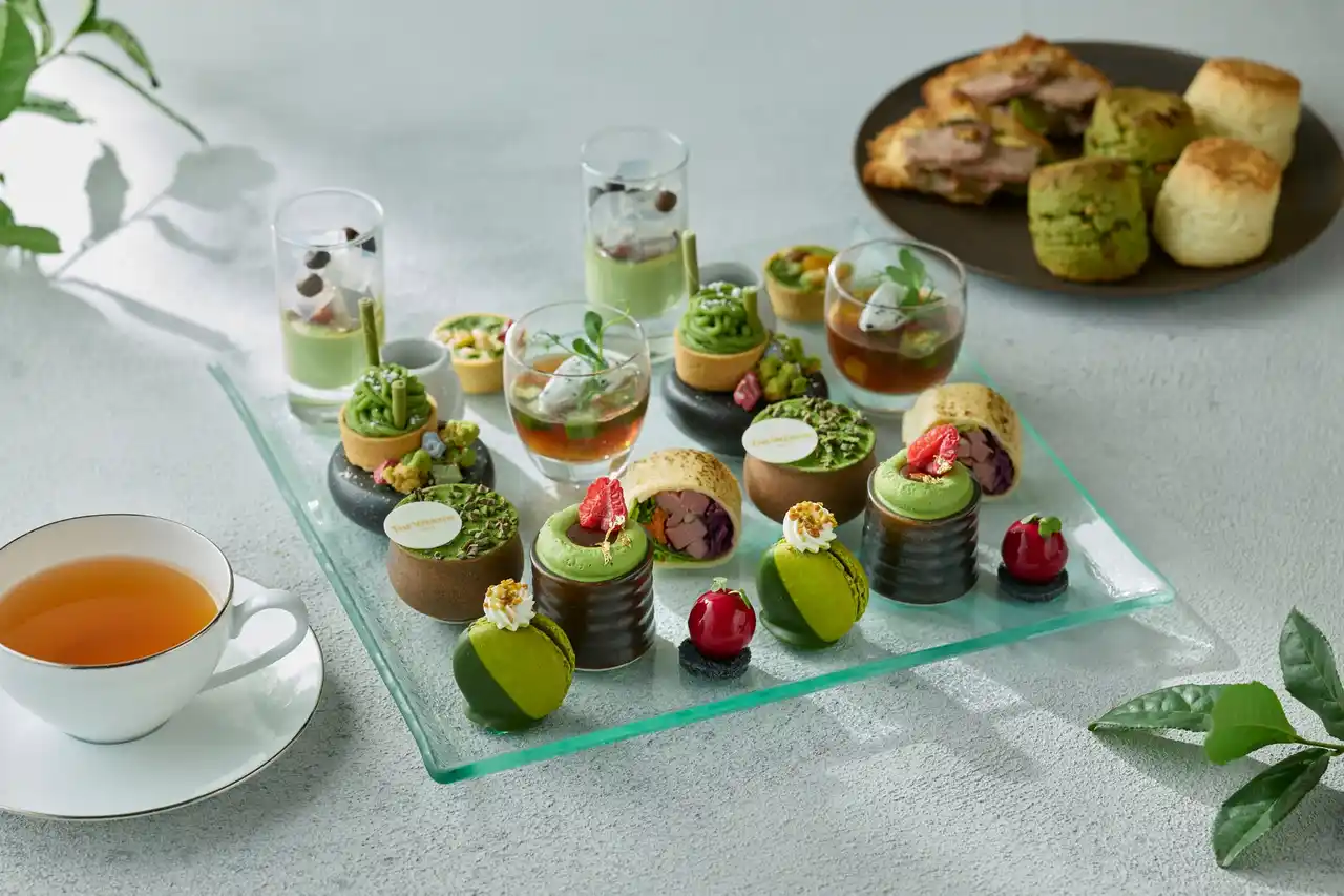 甘酸っぱいベリーと抹茶のほろ苦さが響き合う「赤いベリーと抹茶のグラス」や、抹茶入りホワイトチョコレートガナッシュにココナッツの軽やかな甘みとライムの酸味を重ねた「抹茶とココナッツのタルトレット」、さらに杏子のやさしい甘酸っぱさが抹茶の余韻を引き立てる、なめらかな口どけの「抹茶とアーモンドミルクのブランマンジェ」など、抹茶の奥深さを多彩に表現した8種のデザートをご用意いたします。セイボリーには、薫香と爽やかな酸味のバランスがよい「スモークサーモンのタルタル サワークリーム