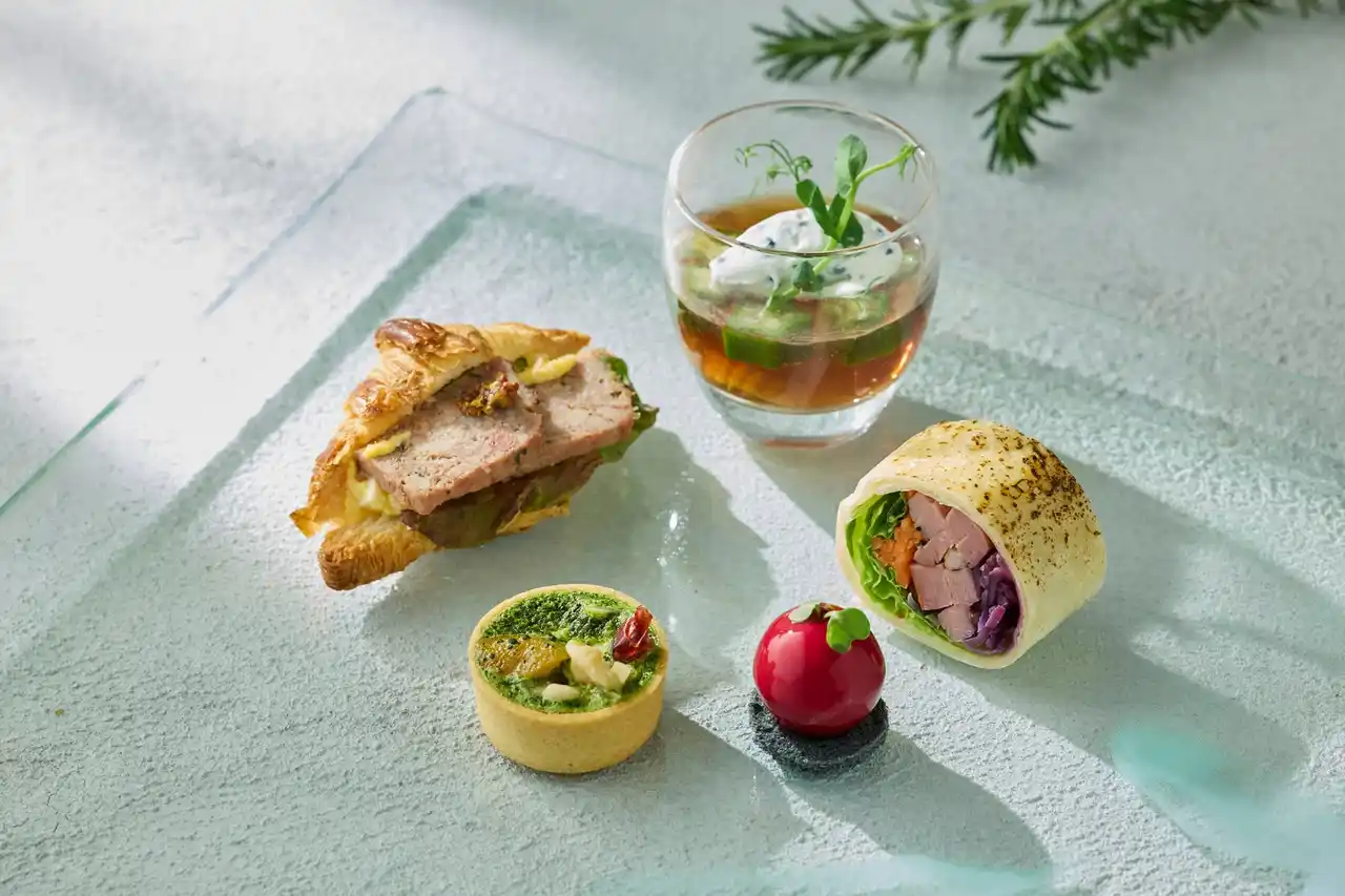 ケッパー添え」や、柑橘とオリーブオイルの香りをまとわせた涼やかな「冷やし茶そば グレープフルーツとオリーブオイル風味のそば汁ジュレ」、ふんわりと抹茶を香らせたブレッドで卵とエビの旨みを挟んだ「抹茶ブレッド 卵とエビのサンドイッチ」など、新緑の季節を感じさせるラインナップを揃えました。 |