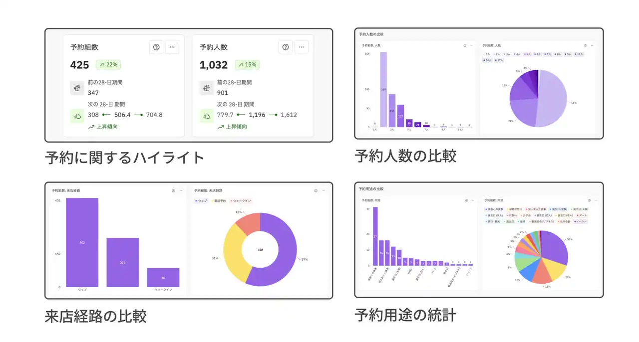 インサイト機能とは、来店人数や予約流入経路、注文数、売上など、蓄積されたデータを視覚的でわかりやすいグラフレポートで表示する機能です。 |