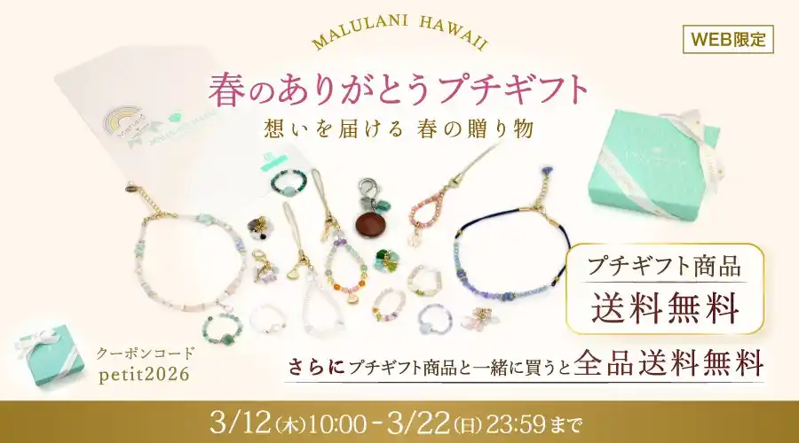 ハワイ発祥の天然石アクセサリーブランド「マルラニハワイ」は、期間限定にて「プチギフト送料無料キャンペーン」を公式オンラインショップにて開催いたします。 |