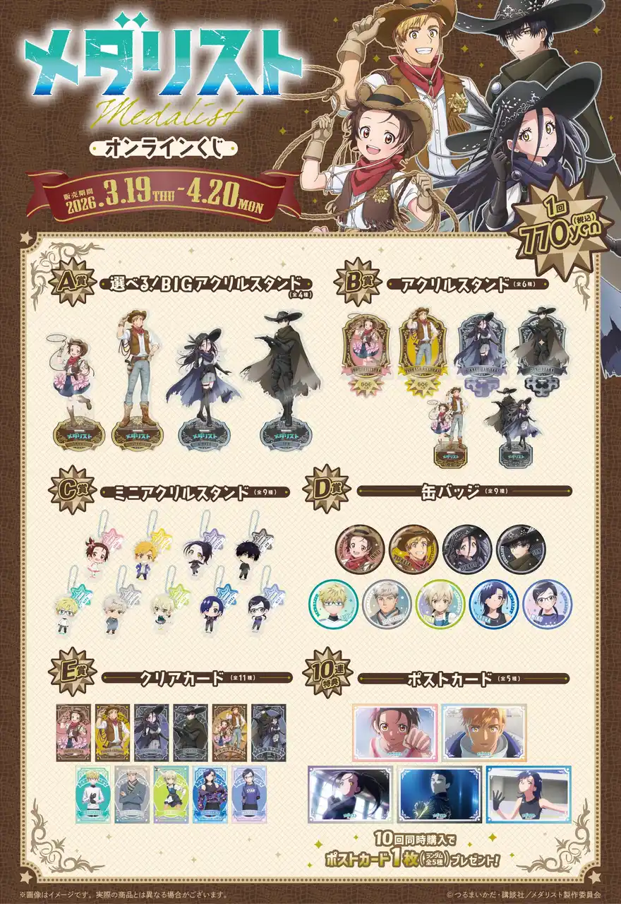 株式会社ブリッジ(本社:東京都千代田区 代表取締役社長:加藤 勝)は、運営するオンラインくじサービス「くじとも」より、TVアニメ『メダリスト』オンラインくじを、2026年3月19日(木)18時より販売します。 |