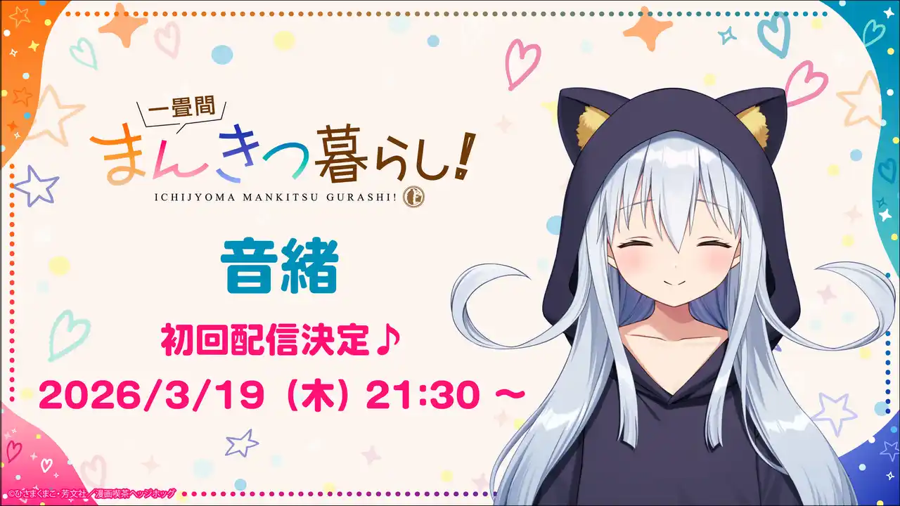 株式会社ブシロード(本社:東京都中野区、代表取締役社長:木谷高明)のグループ会社にあたる株式会社ブシロードムーブ(本社:東京都中野区、代表取締役社長:大貫佑介)は、芳文社「まんがタイムきらら」にて連載中の『一畳間まんきつ暮らし!』(著:ひさまくまこ)の作中キャラクター中埜音緒のVTuber活動開始に関して、情報を公開したことをご案内致します。 |