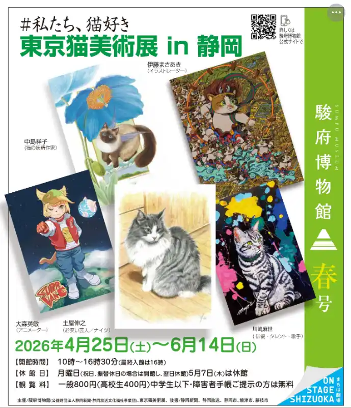 展覧会名: 東京猫美術展 in 静岡 会期: 2026年4月25日(土)~6月14日(日) 会場: 駿府博物館(静岡市駿河区登呂3-1-1 静岡新聞放送会館別館) 主催: 駿府博物館(公益財団法人静岡新聞放送文化財団)、東京猫美術展 休館日: 月曜日(祝日・振替休日の場合は翌日休館)、5月7日(木) |