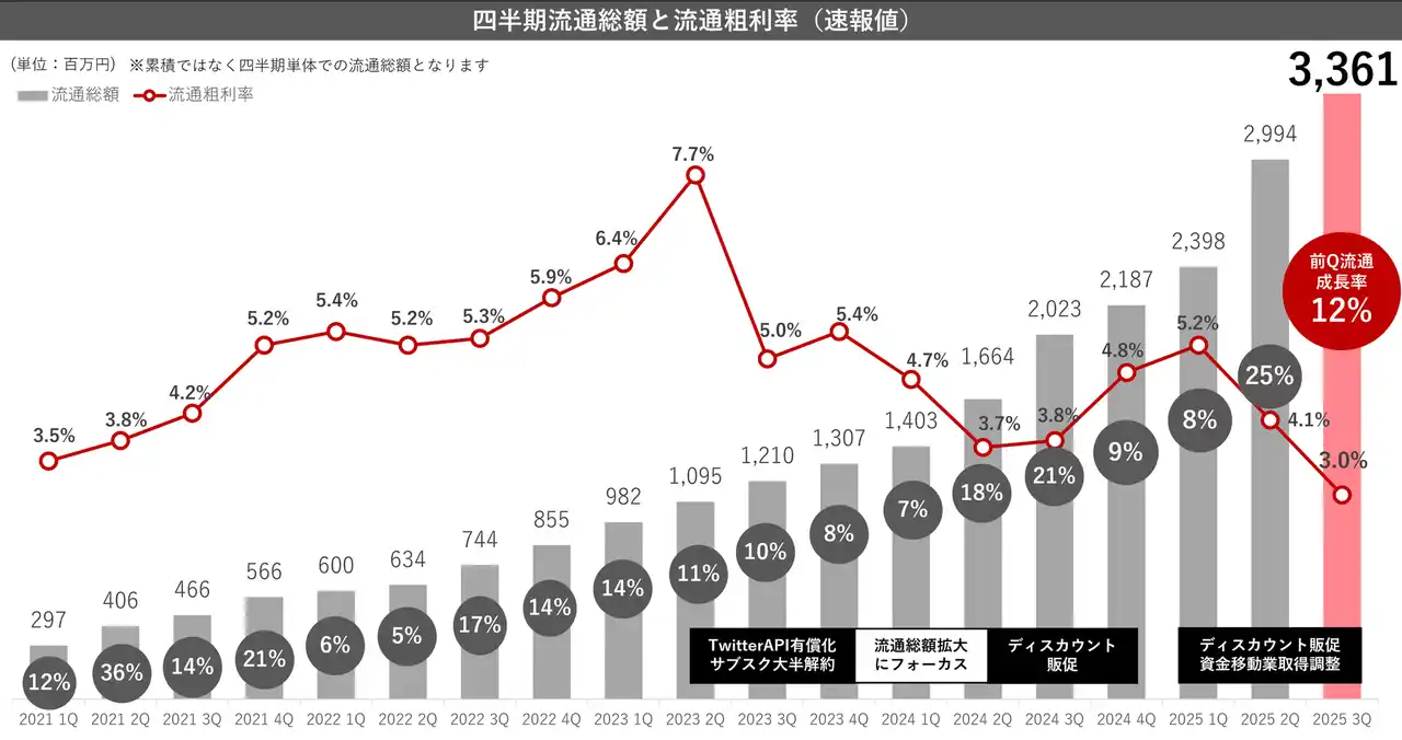2025年9月期第2四半期においては前四半期対比125%、流通総額約30億円へ到達いたしました。流通総額1,000億達成に向けて、「3万円以下のto C現金支払い」を、1.広告領域 2.人材領域 3.金融領域の3軸にて網羅を目指してまいります。各領域における取り組みを強化し、2027年9月期に掲げている流通総額1,000億円を達成することで、圧倒的低手数料を実現し、より多くの企業様にご利用いただけるよう、更に邁進してまいります。 |