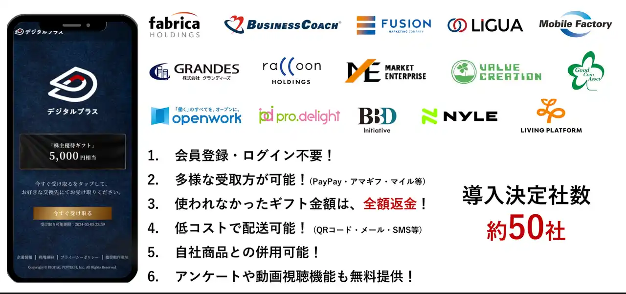 株式会社FCE(代表取締役社長:石川 淳悦、東証スタンダード市場:証券コード9564)において、株式会社デジタルプラス(代表取締役社長:菊池 誠晃、本社:東京都渋谷区、東証グロース市場:証券コード3691)の子会社である、株式会社デジタルフィンテック(代表取締役社長:菊池 誠晃、本社:北海道札幌市)が運営する「デジタルギフト(R)」を株主優待としてご活用いただくことになりました。 |