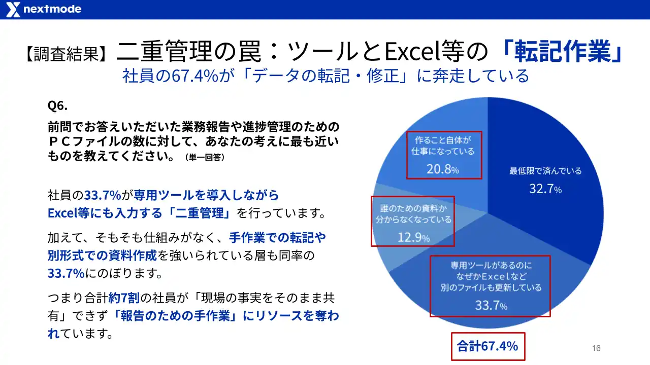 84.9%の社員が報告のためだけに「現場が不要だと感じているファイル」を扱っており、さらに67.4%がデータの転記や別ファイル作成といった手作業による「二重管理」から抜け出せていません。 |