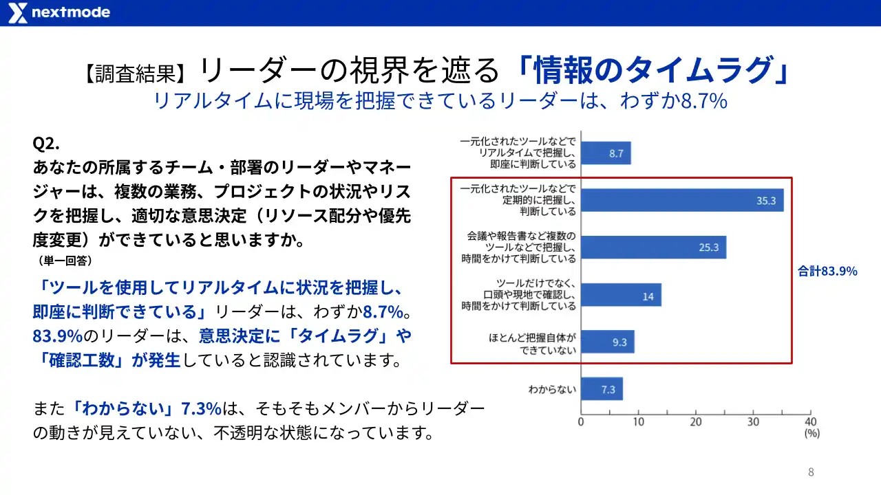 リアルタイムに状況を把握し即座に判断できているリーダーはわずか8.7%。83.9%の現場において、リーダーの意思決定にタイムラグや確認工数が発生していると認識されています。 |