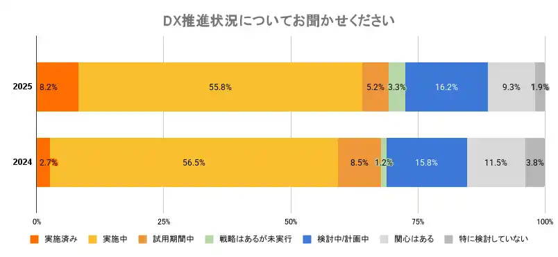 すでに「実行フェーズ」(実施済み・実施中・試用期間中の合計)にある企業は69.2%と約7割という高い水準で定着しています。特に「実施済み」と回答した企業の割合は、2024年の2.7%から8.2%へと約3倍に急増しており、試行錯誤の段階を脱し、実務への定着や成果の刈り取りを目指す運用フェーズへの移行が鮮明に示されました。 |