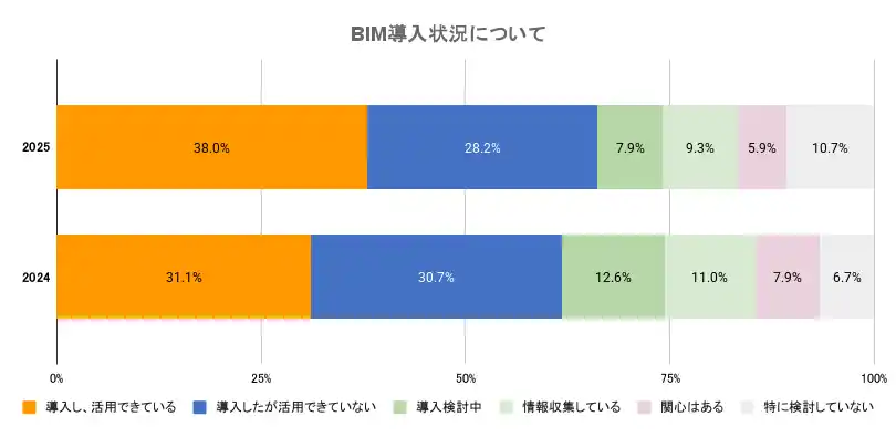 BIMを「導入し、活用できている」層は38.0%(前年比+7pt)へと着実に伸長しました。 一方で、活用の最大の障壁として「現在のCAD等の業務に加えてBIMを活用しており、結果として二重作業になる(20.3%)」が最多となっており、デジタルとアナログの並行運用という構造的な非効率が現場の負担となっている実態が浮き彫りとなりました。 |