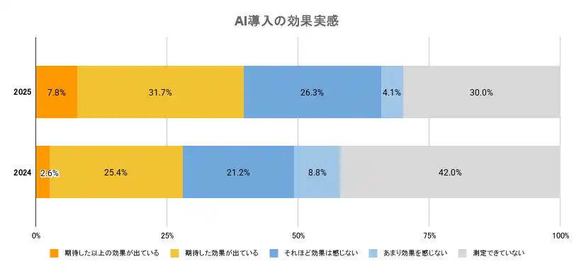業務におけるAI利用において、「活用予定はない」という回答が前年の9.8%から3.2%へと激減しました。 実務に導入している企業の約4割が確かな手応えを感じており、AIは先進的な試行対象ではなく、競争力を左右する標準的な業務ツール(必須要件)としての地位を確立しつつあります。 |