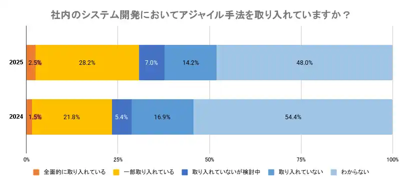 社内システム開発において「アジャイル手法」を取り入れている割合は30.7%(前年比約+7pt)と増加しました。 しかし、組織全体の約半数(48.0%)が自社の開発手法について「わからない」と回答しており、システム開発がIT部門の専門領域としてブラックボックス化し、現場の知恵をシステムに反映させる「共創」の文化が不足している実態が明らかになりました。 |