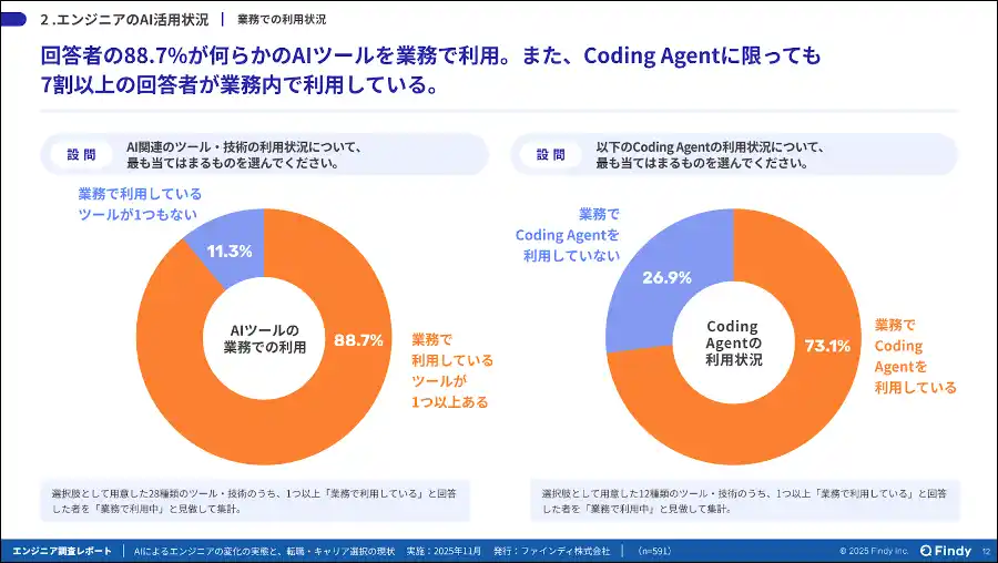 (出所:「AIによるエンジニアの変化の実態と転職・キャリア選択の現状」2025年11月実施、ファインディ株式会社、n=591) |