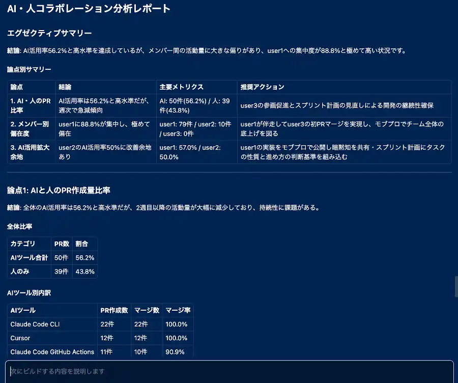 (画像:「Findy AI+」β版の「AI・人コラボレーション分析レポート」機能) |