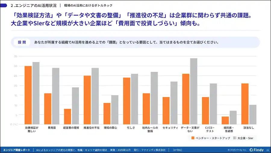 当社が2025年11月に実施した「AIによるエンジニアの変化の実態と転職・キャリア選択の現状」調査(n=591)では、88.7%のエンジニアが業務で何らかのAIツールを利用している一方、職場のAI活用における最大のボトルネックとして「効果検証が難しい」が企業規模を問わず最上位に挙がっています。こうした結果に加えて、当社がクライアント企業から伺う中で、多くの開発組織で、 |