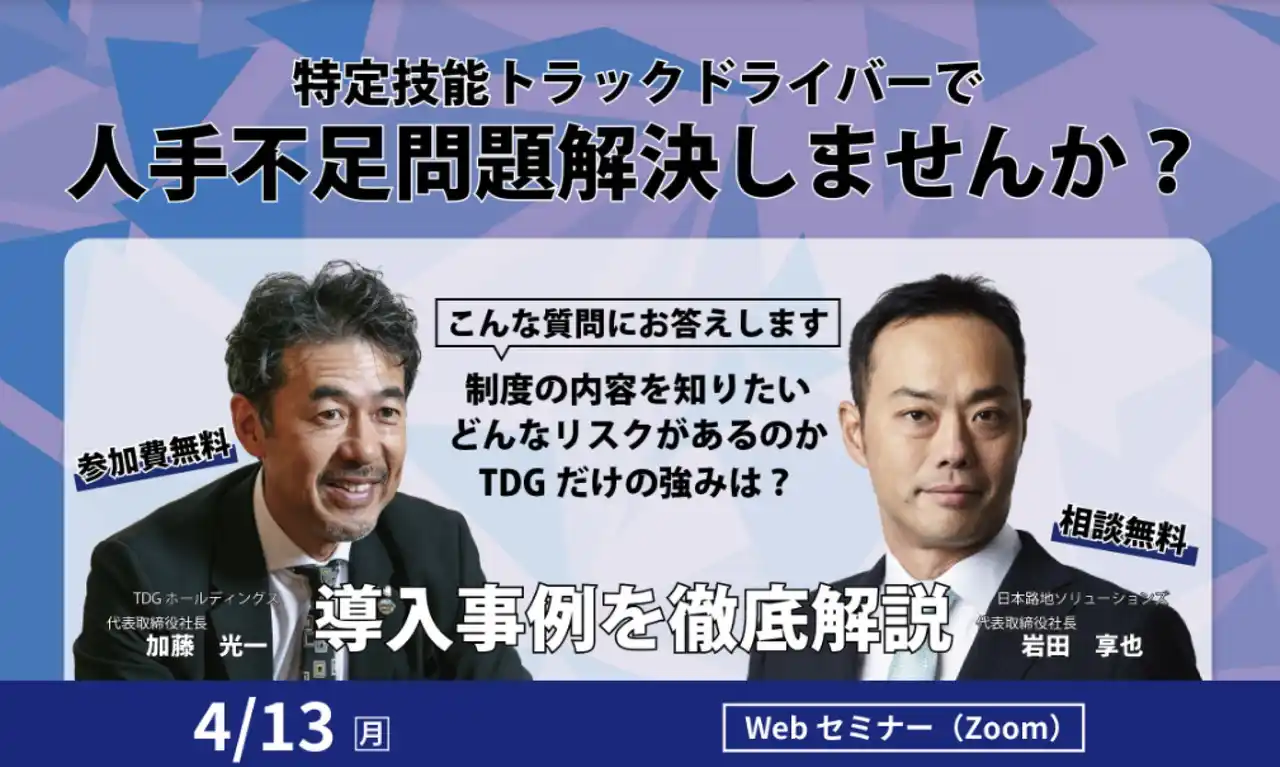 株式会社TDGホールディングス(本社:三重県伊勢市、グループCEO:加藤 光一、以下「TDG」)は、日本ロジソリューションズ株式会社(本社:東京都中央区、代表取締役社長:岩田 享也、以下「日本ロジソリューションズ」)と共同で、第14回目となる物流業界向けウェビナー「外国人特定技能トラックドライバー人材のリアルを解説」を2026年4月15日(水)に開催いたします。 |