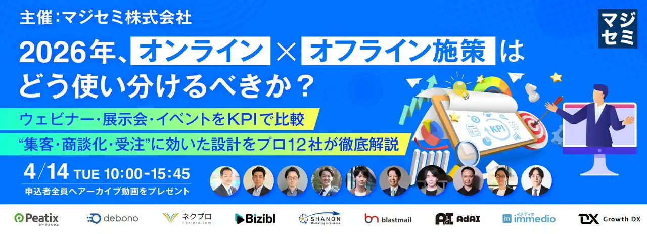 | マジセミ株式会社は「2026年、オンライン×オフライン施策はどう使い分けるべきか?」というテーマのウェビナーを開催します。 |