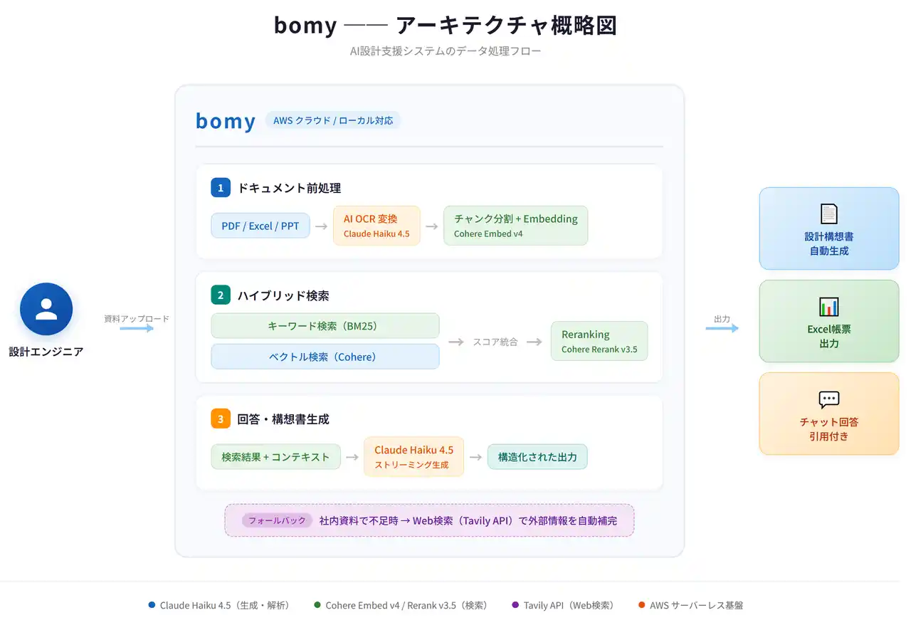 「bomy」は、LLM(大規模言語モデル)とRAG(検索拡張生成)を組み合わせ、社内に蓄積された技術ドキュメントをAIが読み解き、設計構想書の自動生成や技術的な質問応答を実現する画期的なシステムです。