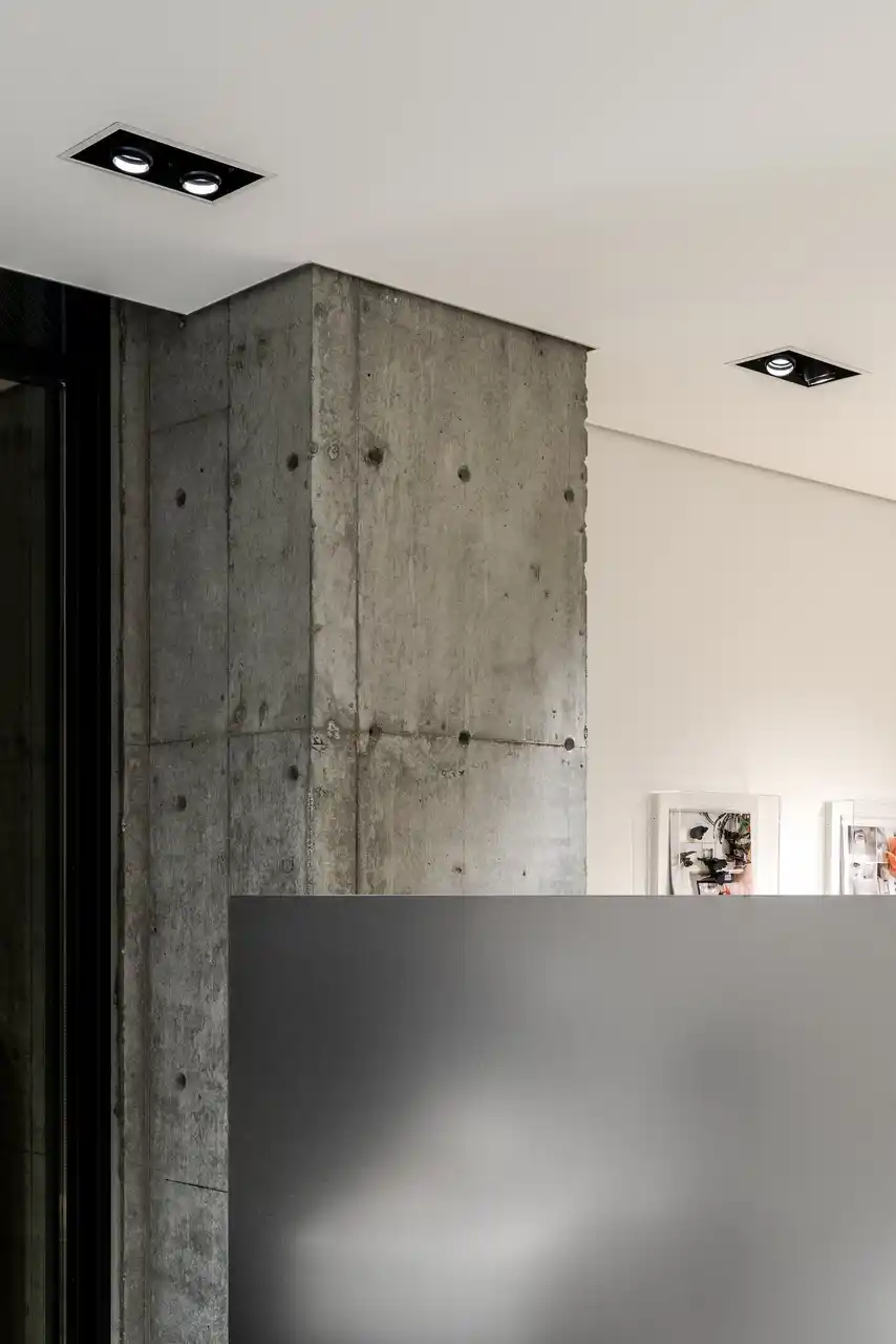 芦屋眼鏡鋪では、あえて天井を低く設定し、梁型が見えるスケルトン天井を隠すことで、眼鏡と向き合うための落ち着きを演出しています。その一方で、足元には300角のスクウェア形状に形取った露骨なコンクリート平板を用いることで、建築が持つ力を内装に転換維持し、空間全体のバランスを保っています。 |