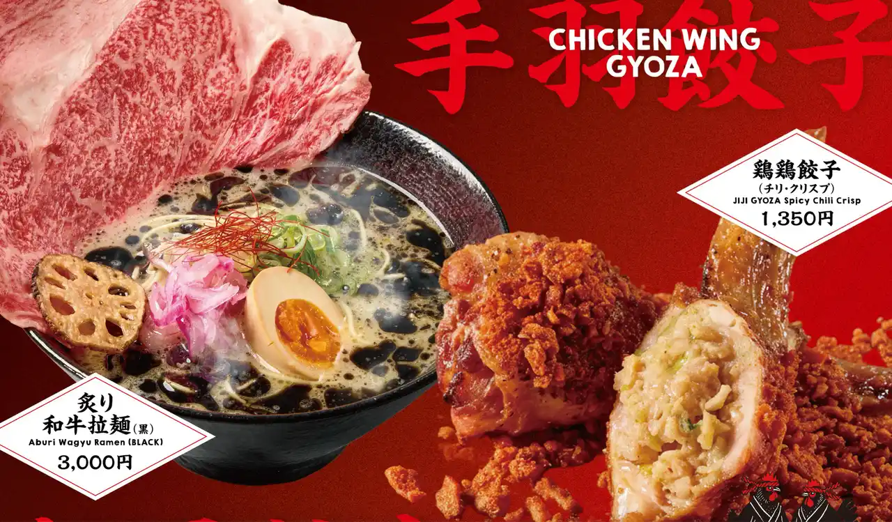 鶏鶏餃子(チリ・クリスプ 2本)1,350円、炙り和牛拉麺(黒)3,000円 |