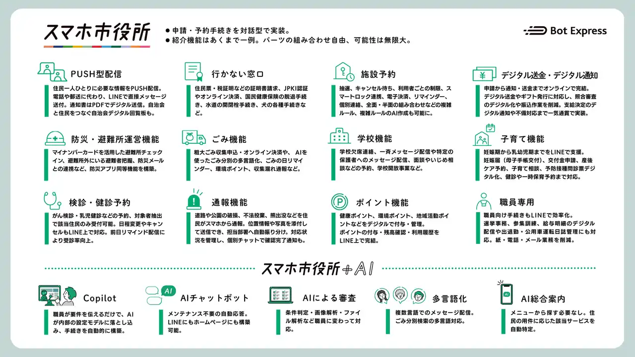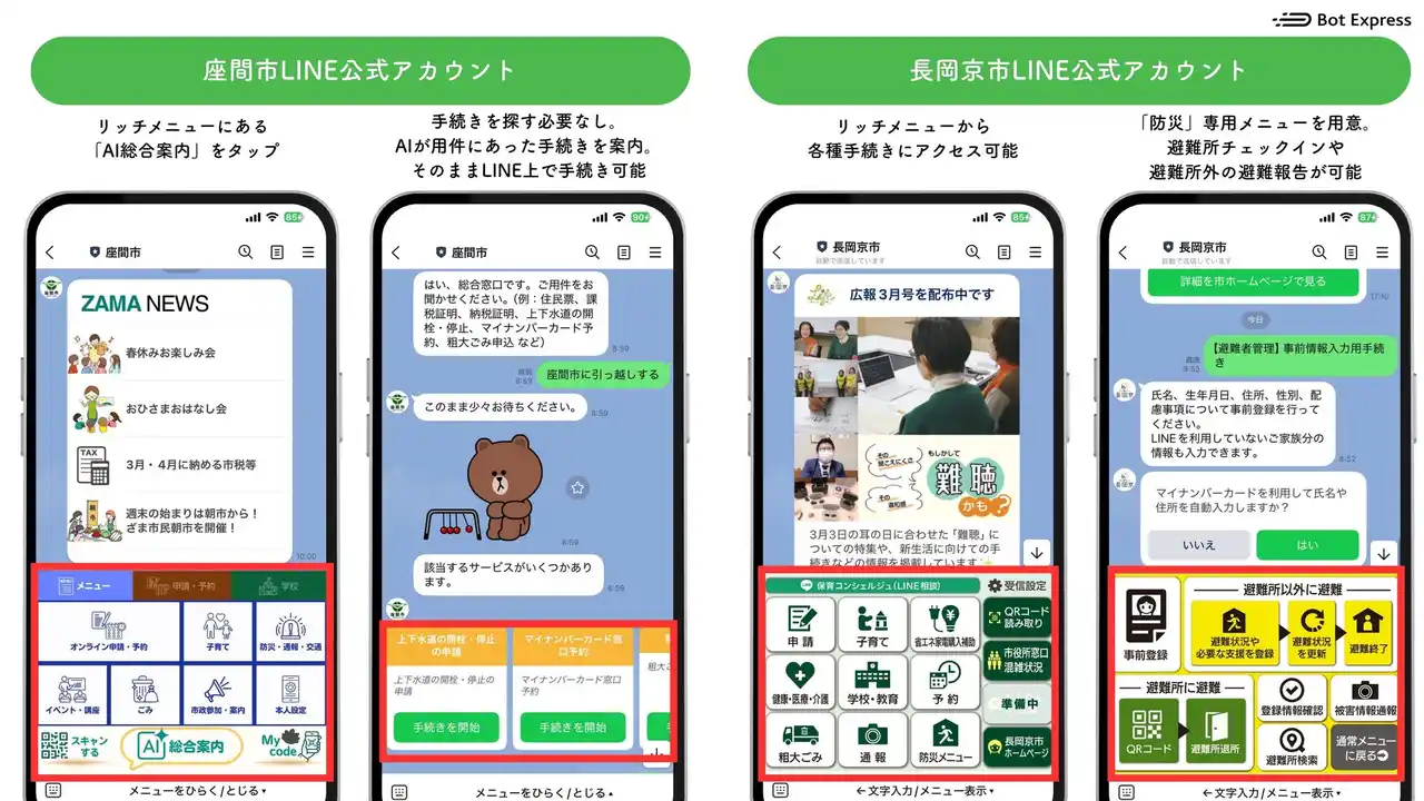 | 両自治体は、LINE公式アカウントとBot Expressが提供する拡張サービス「スマホ市役所(GovTech Express)」を連携させ、LINEひとつで完結する全庁型の行政サービスを展開しています。さらにAI機能の活用も進み、AIを組み込んだ自治体DXへと発展しています。 | |||||||||||