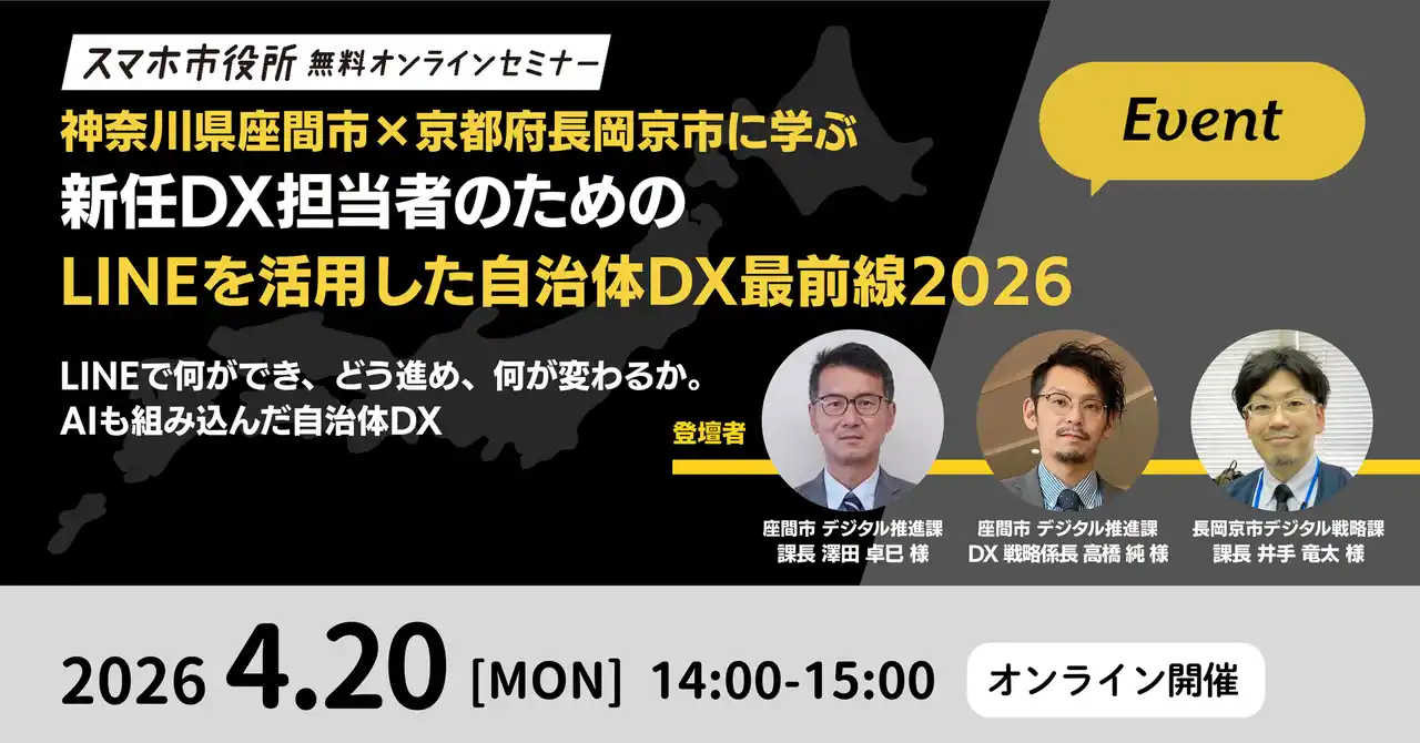 | 4月20日(月)、スマホ市役所オンラインセミナー開催。テーマは「新任DX担当者のためのLINEを活用した自治体DX最前線2026」 |