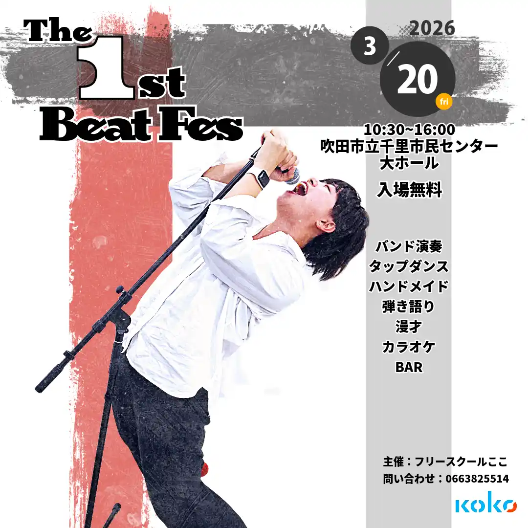 NPO法人ここ(事務所:大阪府吹田市、理事長:三科元明)は、2026年3月20日(金)に吹田市立千里市民センター大ホール(大阪府吹田市津雲台1丁目2−1 2階)にて、音楽フェス「The 1st Beat Fes vol.5」を開催します。 |