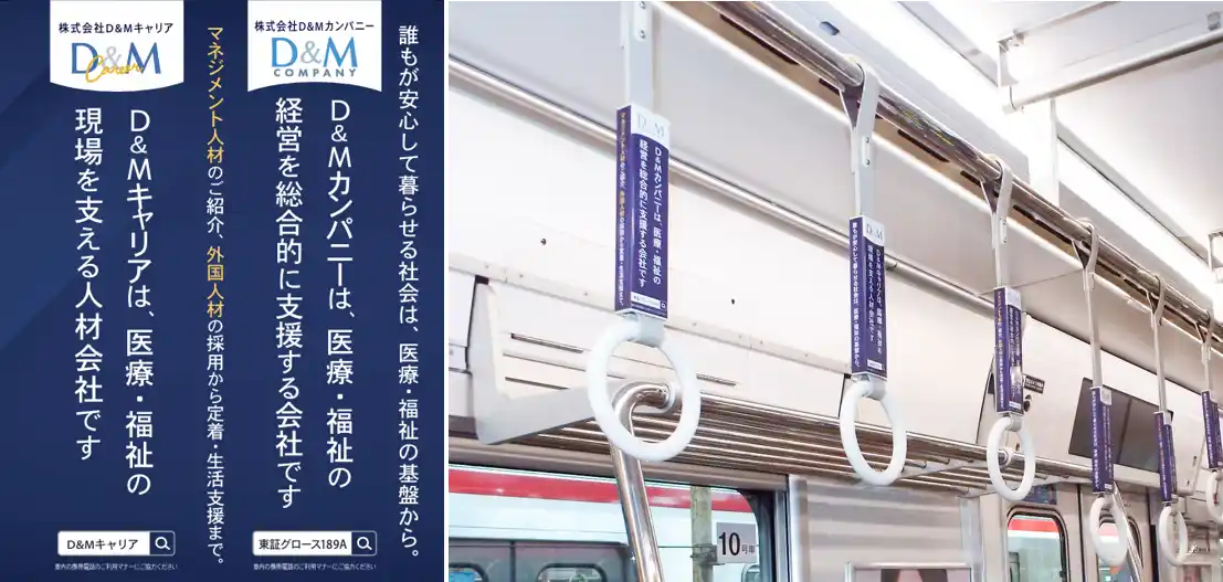 株式会社D&Mカンパニー(本社:大阪市北区 代表取締役:松下明義 証券コード:189A)は、当社サービスの認知向上を目的として、2026年3月13日より 「Osaka Metro 御堂筋線」にて、つり革広告の掲出を開始しました。 |