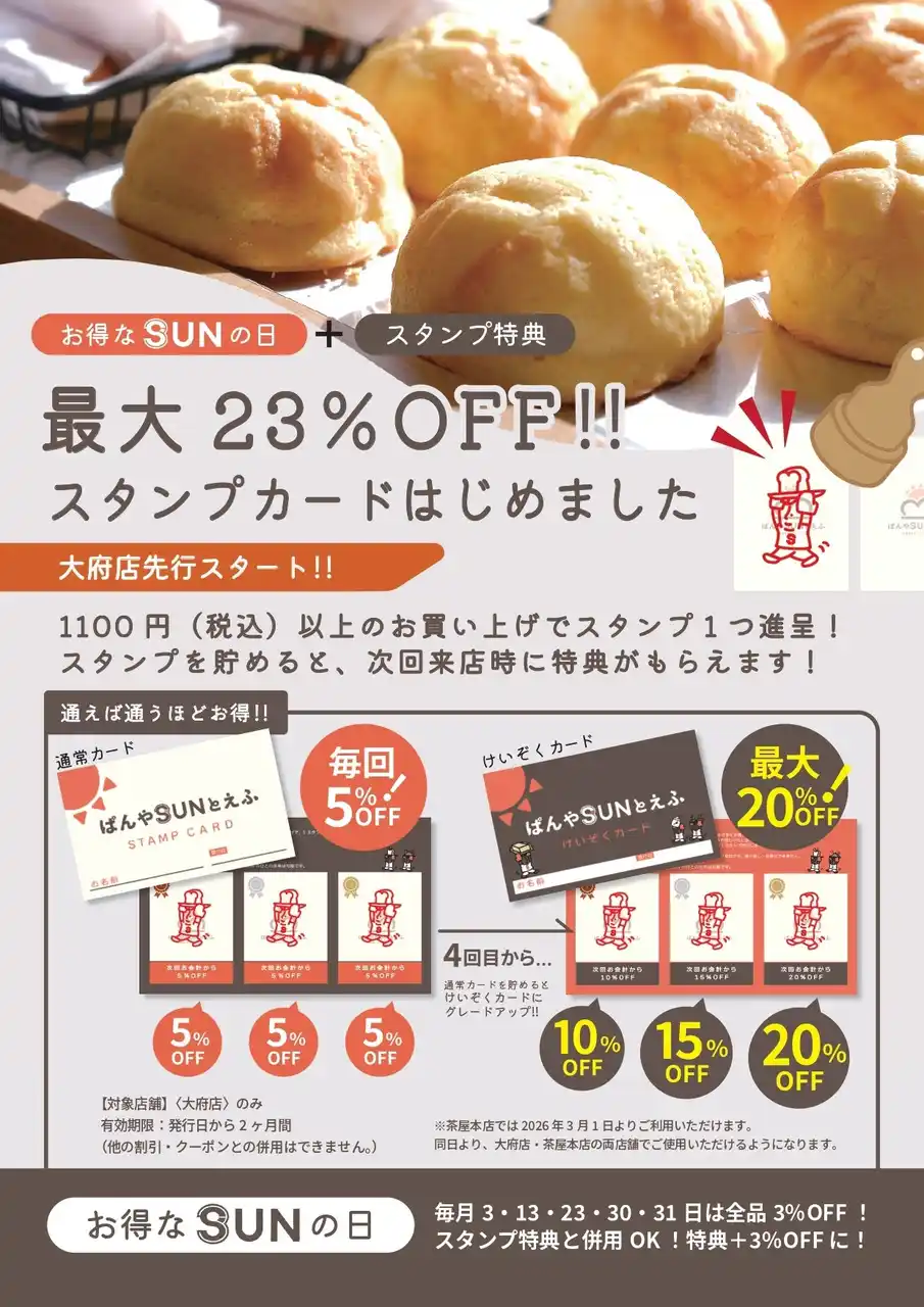 「ぱんやSUNとえふ」では、毎月3日・13日・23日・30日・31日を《SUNの日》として、全品3%OFFを実施しています。スタンプカードの特典はこの《SUNの日》割引と併用することができ、最大で23%OFFと、よりお得に焼き立てパンを楽しむことができます。 |