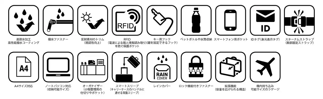 600デニールのPUコーティングポリエステル素材を使用し、豪雨などの厳しい天候にも対応する高い撥水性と耐久性を備えたバックパック。フルオープン仕様に加え、拡張機能付きコンパートメントを採用し、荷物の量に応じて容量を調整できます。圧縮ストラップにより必要に応じてコンパクトにまとめることも可能です。メインコンパートメントには南京錠でロックできる鍵穴付きスライダーを装備。RFID(スキミング)防止ポケットやキーフック、ノートPC用コンパートメントなど、移動の多い日常や出張に便利な機能を備えています。