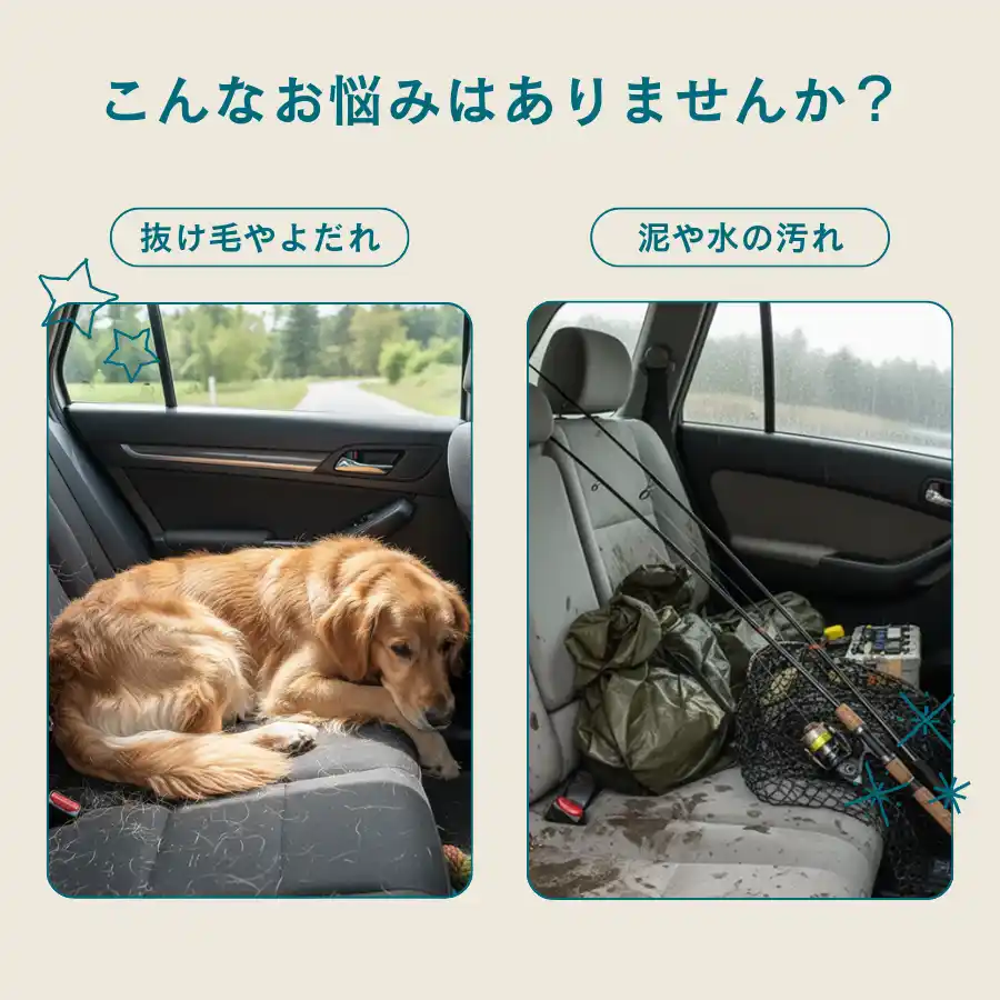 | 公園遊び帰りや運動後の送迎時など、泥や汗で汚れた服のままでも座席汚れを気にしにくくなります。ジュースやお菓子をこぼした場合も、後部座席そのものではなくシート表面の掃除で対応しやすく、保護者の負担軽減にもつながります。 | ||||||||||||||||||||||||||||||||||||
