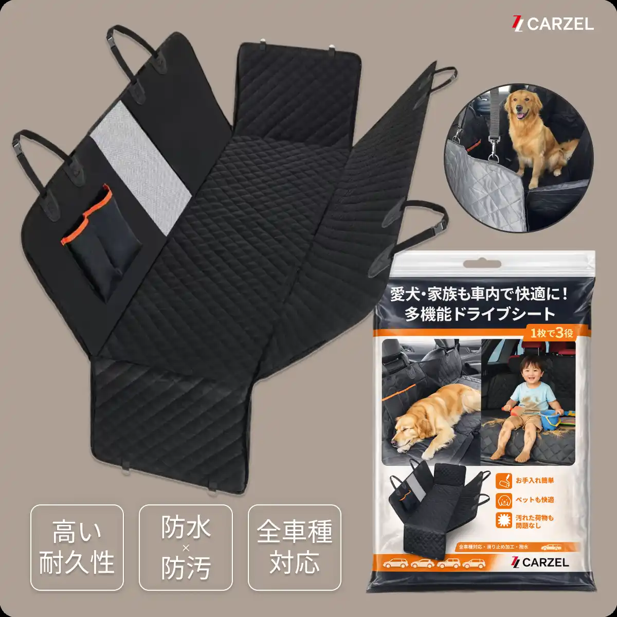 モビフルEC:https://mobiful-ec.jp/products/driveseat-carzel 主な用途:ペット・子ども・荷物の乗車時における後部座席の汚れ・傷防止 素材:600Dオックスフォード防水素材 対応車種:SUV、トラックを含むほぼ全ての車種 特徴:防水、耐摩擦、可視メッシュ窓、安全ベルト付属、収納ポケット付き、折りたたみ収納可 |