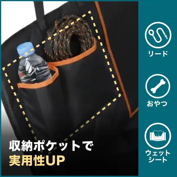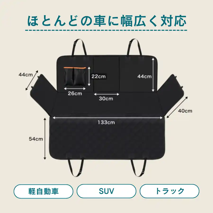 | また、SUVやトラックを含むほぼ全ての車種に対応する汎用設計を採用。使用しない際は折りたたんでコンパクトに収納でき、省スペースで保管可能です。収納ポケットも備えており、おもちゃや飲み物、リード、ウェットティッシュなど、おでかけ時に必要な小物類をまとめて収納できます。 | ||||||||||||||||||||||||||||||||||||