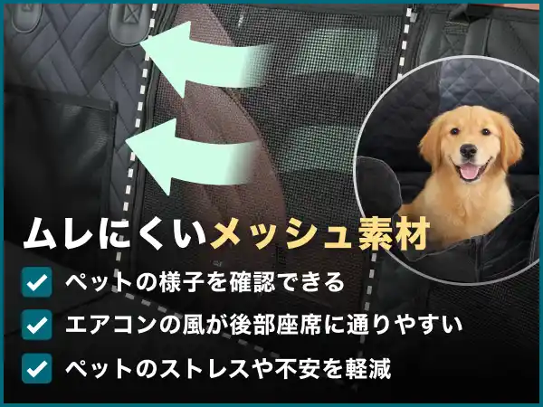 また、前席と後席の間には視認性の高い可視メッシュ窓を採用。後部座席までエアコンの風が届きやすく、通気性に配慮した設計となっています。飼い主とペットがお互いの様子を確認しやすいため、移動中の不安やストレスの軽減にもつながります。 |