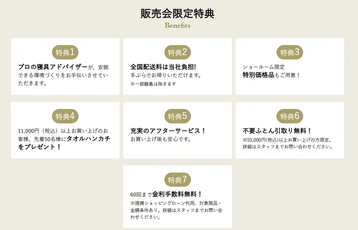 実際に手に取り、横になり五感で選べるのはショールームならでは。55周年を迎えるロングセラーMuAtsu(ムアツ)マットレスをお試しいただけるのはもちろんのこと、販売会限定の7特典もご用意してお待ちしております! |