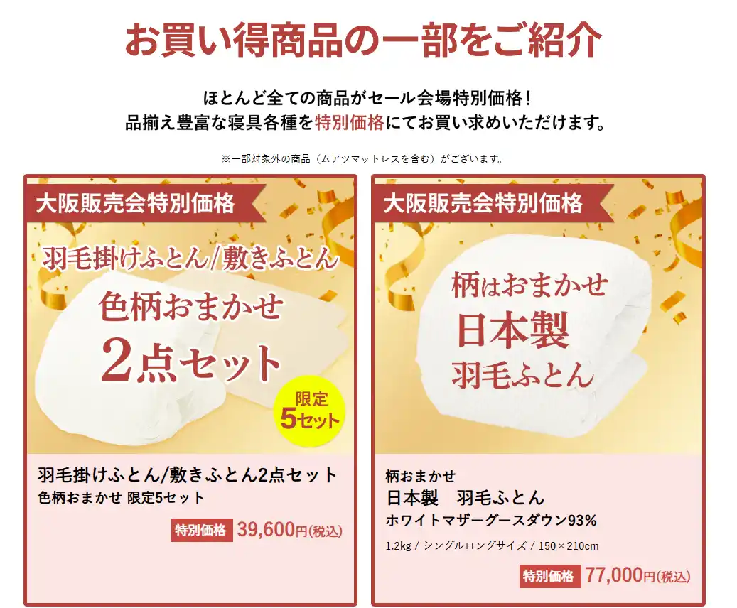 肌寒さが残りながらも、日差しに春を感じるこの季節は、眠る環境を見直す絶好のタイミング。本セールでは旧柄の羽毛ふとんを初めとした高品質な寝具を大阪ショールーム限定の特別価格でご提供いたします。春の寝具選びをお考えの方は、ぜひ、この機会をお見逃しなく。 |
