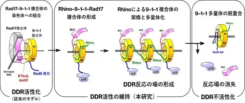 図2 ATR依存的DDRの段階的移行: 活性化したDDRが活性維持段階を経て不活性化段階へと移行するメカニズムを提案。特に、Rad17-9-1-1-Rhino複合体の構造遷移が各段階の移行の基盤となると示唆された。活性維持段階においては、集積したDDR関連タンパク質によってDDR反応の場としてのフォーカスが形成され、DDR不活性化段階においては、DDR関連タンパク質が拡散し、反応の場が消失すると考えられる。 |